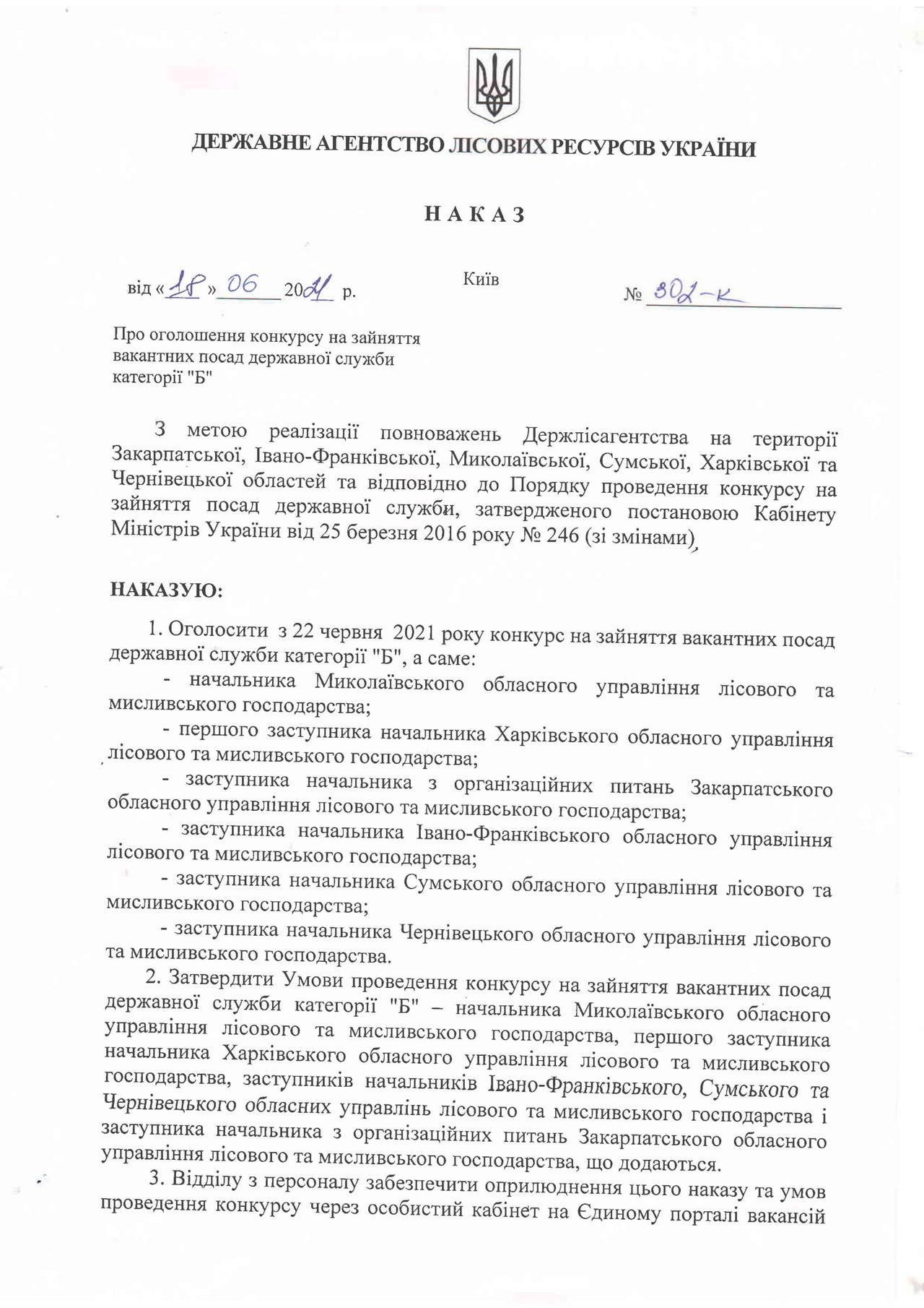 Відповідно до наказу Держлісагенства від 18.06.2021 №302-к з 22 червня оголошено конкурс на зайняття вакантних посад категорії “Б” , а семе: