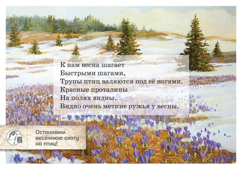 Накануне охотничьего сезона общественная организация «Ахова птушак Бацькаўшчыны» вновь обратила внимание на проблему весенней охоты на водоплавающих птиц. В этом году она решила отойти от традиционного сбора подписей против стародавнего увлечения охотников и вместе с рекламным агентством Publicis Hepta Belarus издала открытки. В первую очередь они адресованы Министерству лесного хозяйства, охотничьим обществам и другим активным организаторам и защитникам весенней охоты. В них строки известных русских поэтов рифмуются с фразами на тему отстрела уток. В итоге получаются довольно провокационные стихи.