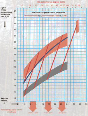 У цілому з метою покращення планування й призначення рубок догляду необхідно переходити на засади програмованого лісовирощування. Основна перевага такого підходу – можливість планування рубок на ділянці лісу протягом всього циклу його вирощування. Як свідчить практика європейських країн, дані програми розроблюються, виходячи із цільових запасів та діаметрів насаджень у віці головної рубки, що встановлюються залежно від продуктивності умов місцезростання. Вихідними даними для вибору режиму догляду для конкретного насадження є його вік, верхня висота, абсолютна повнота. Червоною смугою на графіку наведені суми площ поперечних перерізів дерев, за яких слід проводити рубку догляду, і сірою – максимум зрідження, червоні похилі лінії – тренди відновлення повноти після рубки. Розрив у червоній смузі вказує на вік припинення рубок догляду, після якого через певний проміжок часу насадження підлягатиме головній рубці. Характеристики насадження, в якому проводитиметься головна рубка, показані відокремленою червоною смугою.