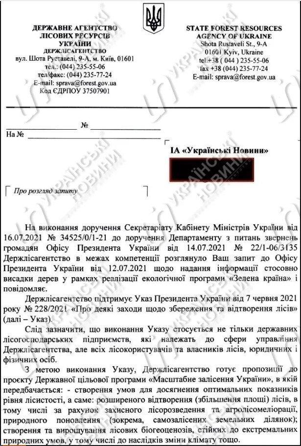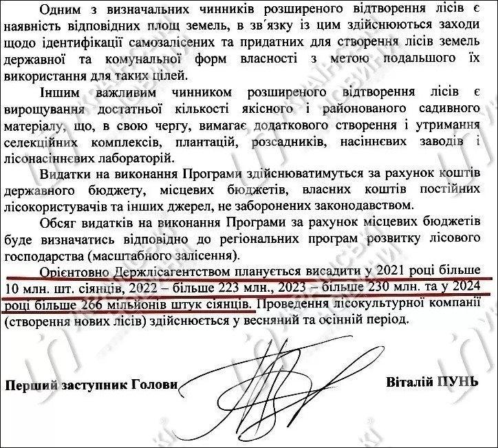 За передбачений документом період агентство планує висадити понад 729 млн саджанців, а не мільярд. Серед них: у 2021 році – більш як 10 млн саджанців; у 2022-му – понад 223 млн молодих дерев; у 2023-му – понад 230 млн нових дерев; у 2024-му – понад 266 млн штук саджанців. В агентстві наголосили, що указ Зеленського про збереження лісів стосується не тільки державних лісгоспів, а й усіх власників лісів і лісокористувачів, юридичних і фізичних осіб.