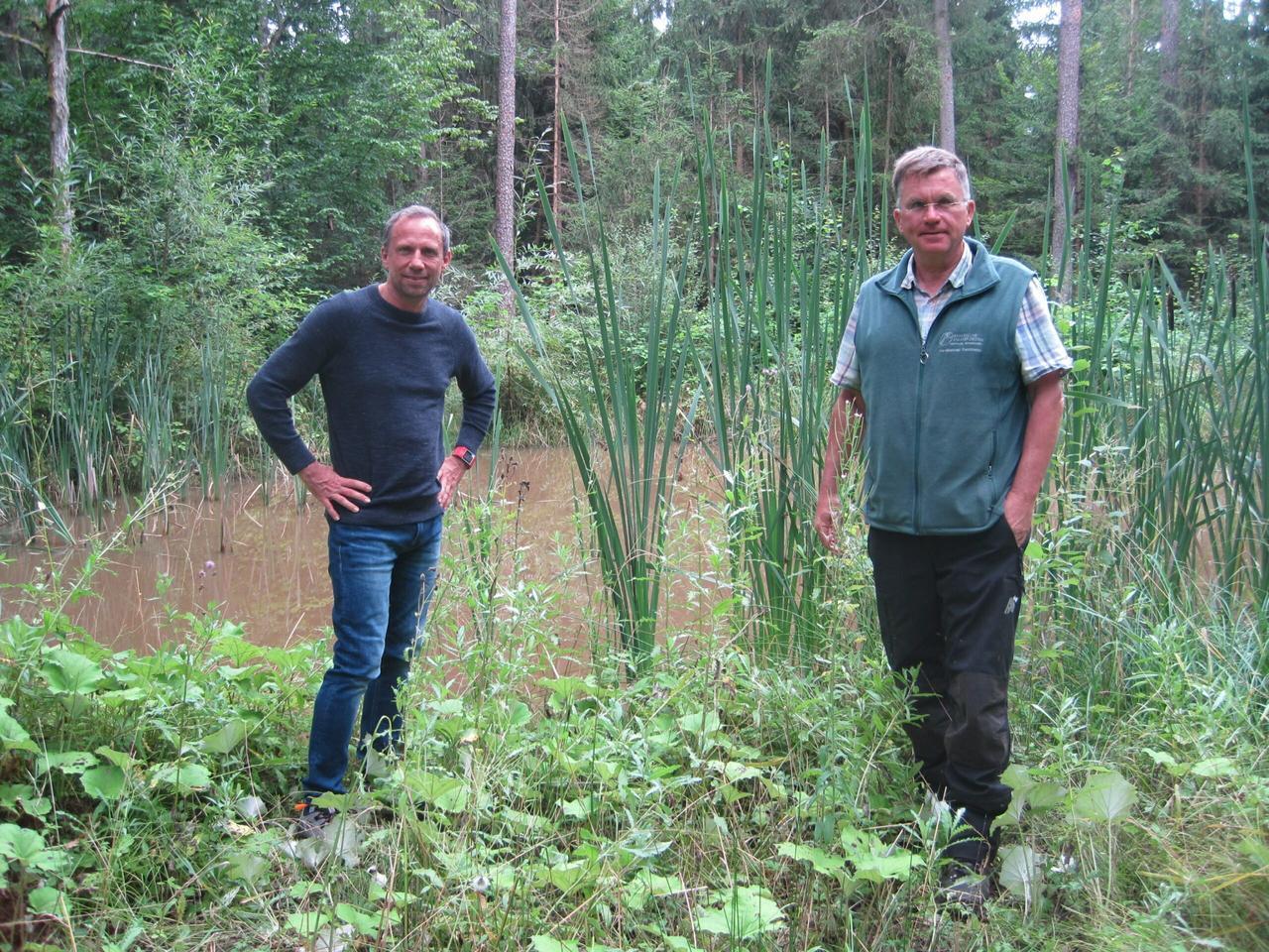На фото: Государственный министр Торстен Глаубер (слева) и районный управляющий Эрих Даум (справа) убеждены в важности наличия разнообразных водно-болотных угодий в Государственных лесах Баварии ( BaySF).