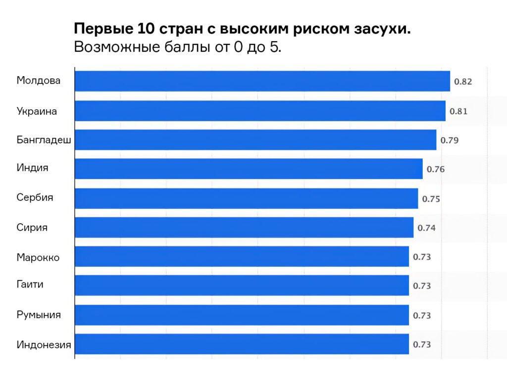 Молдова, Украина, Бангладеш, Индия, Сербия. Ученые собрали данные 138 стран и составили отчет по рискам засухи в мире. Они учли такие показатели: