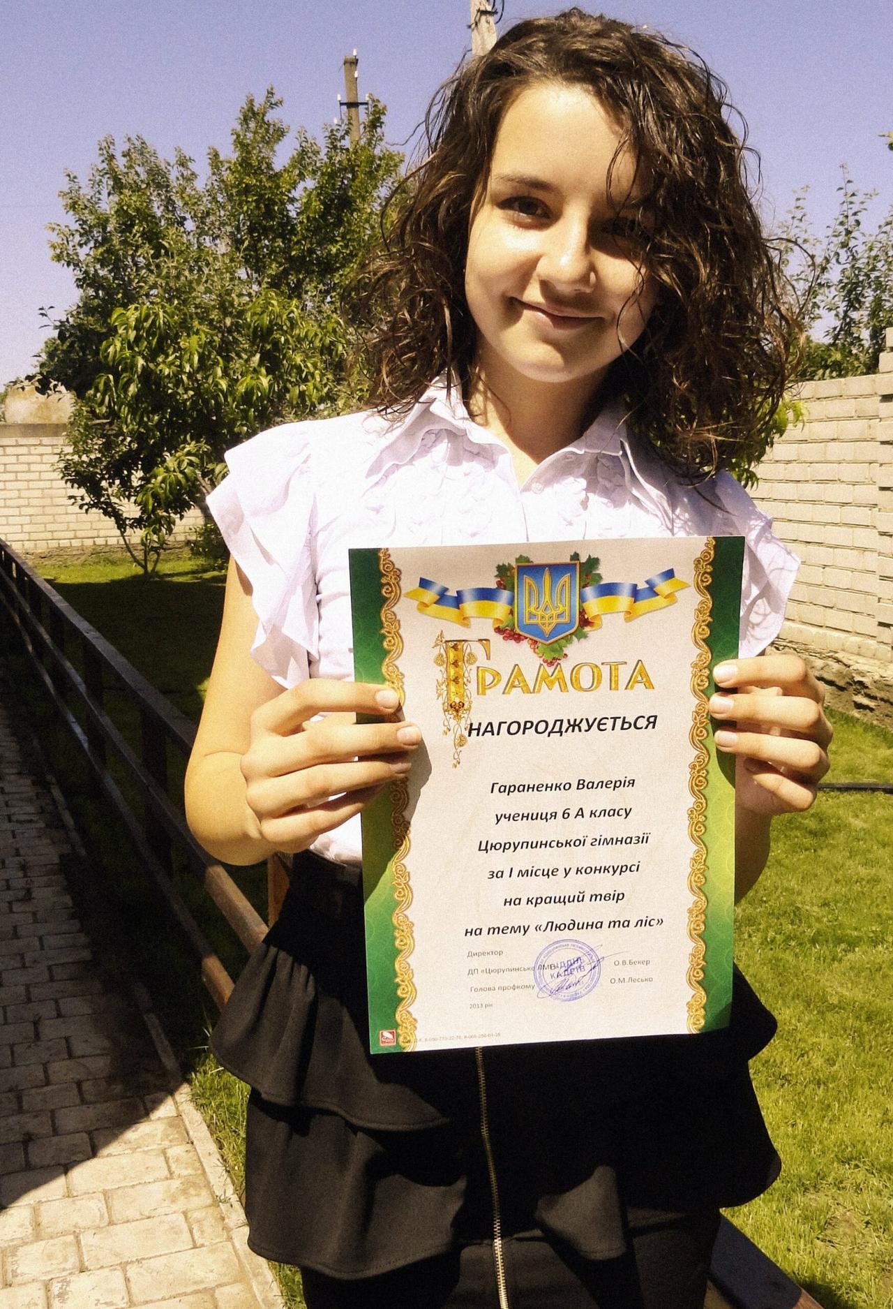 Неможливо не відмітити вірш, який написала володарка першого місця Валерія Гараненко, учениця 6 класу Цюрупинської гімназії (на фото). Читати цей вірш неможливо без сліз на очах. Скільки пронизливого болю в цьому вірші. Наскільки дитячі серце та душа перейнялись реаліями подій 2012 року. Якби ми всі дорослі розуміли біду, яку приносять пожежі, можливо б, задумались над своєю поведінкою у лісі та над тим, що залишається після відпочинку в ньому?! Купи сміття, непогашені багаття, кинуті недопалки – все це призводить до виникнення пожеж. Тож, дорослі, прочитаємо вірш дитини та задумаємося…