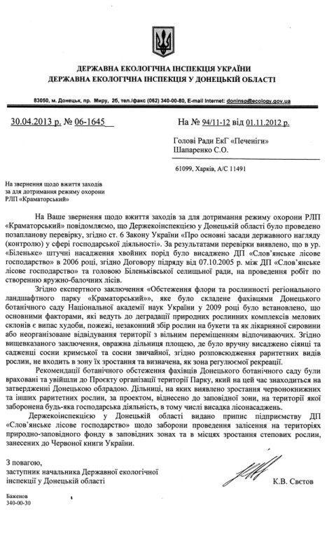 К счастью, не все контролирующие органы работают так же, как Донецкая экоинспекция! 22 марта в отдел по борьбе с экономическими преступлениями Краматорского городского отделения милиции нами было подано заявление "Про осуществление ДП "Славянский лесхоз" криминального преступления на территории РЛП "Краматорский"". Суть заявления состоит в нецелевом использовании достаточно большой суммы бюджетных средств, предназначенных для посадки сосны, в местах, где это запрещено законом – на территориях природно-заповедного фонда. На незаконность проведения этого мероприятия указывает целый ряд фактов: отсутствие у Славянского лесхоза актов на землю, отсутствие на проведение такого облесения разрешения от областного управления охраны окружающей среды и т.п. На данный момент по этому обращению возбуждено уголовное дело.