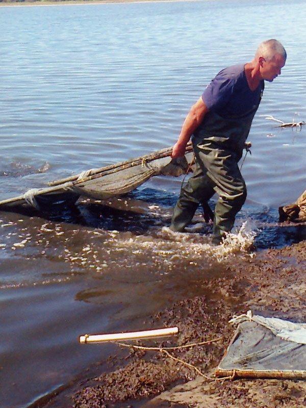 Рибінспекція викрила злочинне угрупування браконьєрів, яке працювало на підприємця з Херсона. Воно «спеціалізувалося» на видобуванні крихітного рачка — артемії, який водиться у каскаді Марківських солоних озер Голопристанського району області. Фото: Ось так браконьєр тягає волокушу озером.