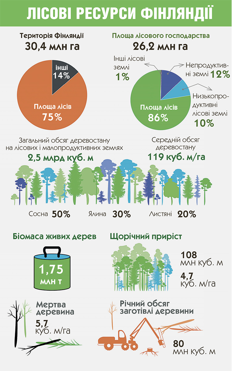 З огляду на ступінь лісистості та обсяги заготівлі деревини, працювати фінам є над чим. Так, ліси займають понад 75% території Фінляндії, що робить її однією з найбільш лісистих країн Європи, при цьому для виробництва деревини придатні близько 20,3 млн га лісових угідь. Фінські ліси щорічно зростають приблизно на 108 млн кубометрів. Малопродуктивні ліси становлять 10%, а повністю або майже безлісні непродуктивні землі – 12% лісових земель. Лісові дороги та інші лісогосподарські ділянки займають 1% лісових площ. При цьому, за даними Національної інвентаризації лісів, проведеної у 2015–2019 роках, загальний обсяг деревостану на лісових і малопродуктивних землях становить 2,5 млрд кубометрів, а середній на 1 га лісової площі – 119 кубометрів.