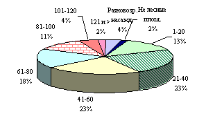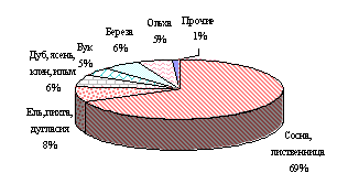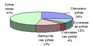 В 2001 году LP заготовлено 23,4 млн. кбм ликвидной стволовой древесины, в том числе от рубок главного пользования 9,34 млн. кбм (87% расчетной лесосеки) и 14,1 млн. м3 (115% отведенной нормы и 60% общего объема заготовки) в ходе промежуточного пользования. Структура заготовок по видам рубок приведена на рис.6. Необходимо отметить, что площади сплошных рубок значительно снизились за последние 20 лет – с 43 тыс.га до 26 тыс.га. В порядке санитарных рубок было заготовлено 3,7 млн. м3 древесины, что составило 15,7% от общей заготовки. Для сравнения в 1983 году в порядке санитарных рубок было заготовлено 16,8 млн м3 древесины, что составляло 73,5% заготовок.