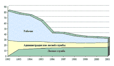 В компании работает 32,3 тыс. человек, из которых 29,6 тыс. – непосредственно в надлесничествах. Из общего количества работающих 50,3% представлено лесной службой, 24,6% сотрудников администрации вне лесной службы, 22,9% рабочих, 2,2% работников других категорий. Численность сотрудников LP сокращается ежегодно. Так по сравнению с 1997 годом произошло сокращение на 8,8 тыс. человек, а с 1992 годом на 49,2 тыс.человек в основном за счет рабочих (7,4 тыс.человек в 2001 году против 16,3 тыс. в 1997 году и 54 тыс в 1992 году). Динамика численности работающих представлена на рис. 10.