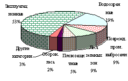 Считается, что леса Польши выполняют три равнозначные функции – экологическую, производственную и социальную. Леса, выполняющие преимущественно экологические и социальные функции, выделяются в Польше с 1957 года. Их площадь быстро увеличивается, в основном за счет изменения целевого назначения государственных лесов. Только за последнее десятилетие (1990-2000 годы) она выросла на 21%. Доля насаждений, выполняющих преимущественно экологические и социальные функции, в государственных лесах составляет 47,3%, гминных – 35,4%, частных – 5,2%. В отличие от Украины, в большинстве лесов специального назначения (почвозащитных, водоохранных, зеленых зон и т.д) разрешено проведение рубок главного пользования. Действующие ограничения касаются в основном параметров лесопользования (в некоторых случаях запрещаются сплошные рубки, ограничивается площадь лесосек, увеличивается возраст рубки) и требований к породному составу и возрастной структуре восстанавливаемых древостоев. На рисунке 3 представлено распределение лесов государственной компании по целевому назначению по состоянию на 2001 год. Отметим, что в отдельную категорию в Польше выделяют леса, поврежденные промышленными выбросами, расположенные, как правило, в горных районах страны.