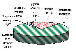 Общие представления о структуре собственности на леса в Польше дают данные представленные на рисунке 4. Леса общегосударственного значения находятся в управлении государственного холдинга Lasy Panstwowe (LP) ("Казенные леса Польши" ) (78.3%) и национальных парков (2%). В частную собственность передано 16,3% общей площади лесов. Как правило, частные леса находятся на землях сельскохозяйственных предприятий и сильно фрагментированы. Средний размер частного владения 1,3 га. Площадь лесов находящихся в собственности гмин, земельных кооперативов и других общественных объединений незначительна.