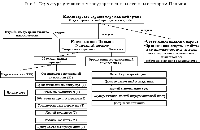 Профильным лесным министерством в Польше является Министерство охраны окружающей среды, носившее до апреля 1998 года название Министерства охраны окружающей среды, природных ресурсов и лесного хозяйства. (рис.5).