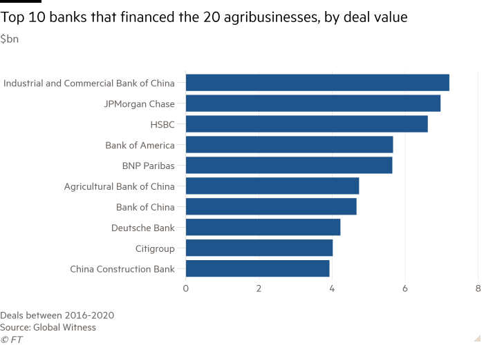 Дані про більш ніж 5000 транзакціях, наданих FT, показують, що п’ять найбільших банків за загальним обсягом транзакцій, включаючи BNP Paribas і Промислово-комерційний банк Китаю (ICBC), здійснили близько 570 транзакцій по облігаціях, кредитах та андеррайтингу двадцяти агропідприємств на загальну суму 32 мільярда доларів за звітний період.