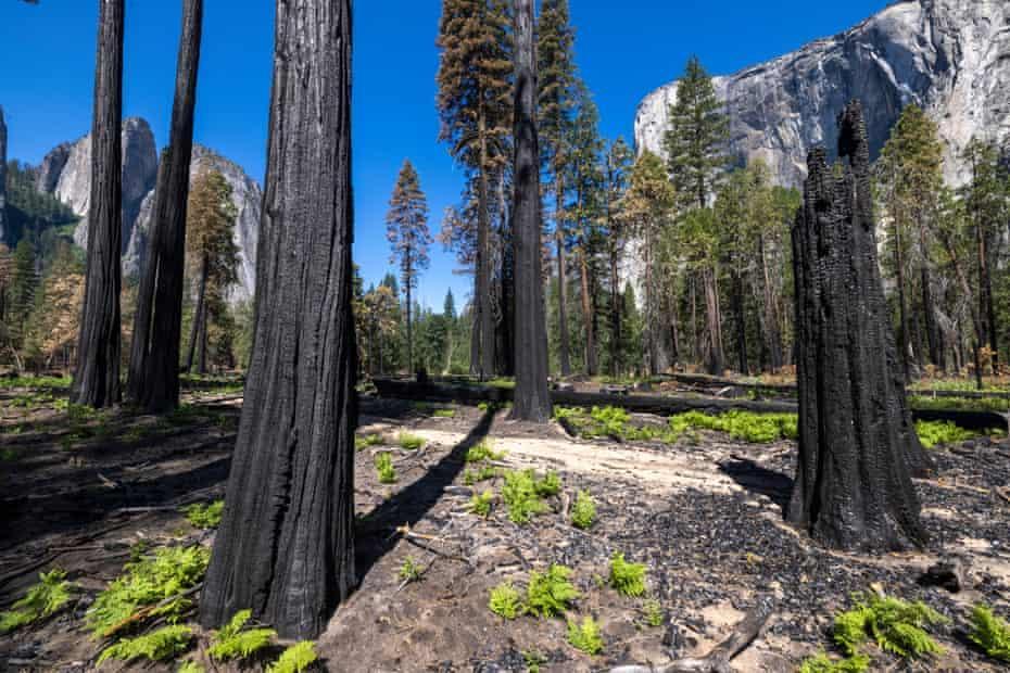 На фото: Сгоревшие деревья в национальном парке Йосемити, Калифорния. Согласно анализу, объект всемирного наследия выделяет больше углерода, чем поглощает. Фотография: Дэвид МакНью / Getty Images