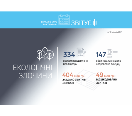 З початку роботи ДБР повідомлено про підозру 334 особам у вчиненні екологічних кримінальних правопорушень, стосовно 292 фігурантів до суду направлено 147 обвинувальних актів.