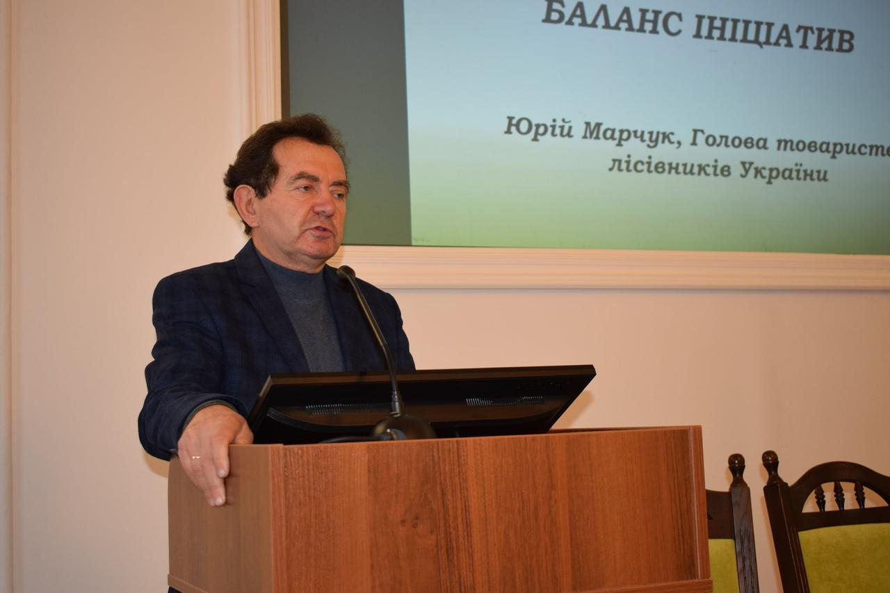Голова Товариства лісівників України Юрій Марчук:«Ми традиційно намагаємося знайти баланс інтересів. Коли ми шукаємо цей баланс, ми повинні розуміти не лише роль лісів, а й ряд інших проблем, які є в Україні.Якщо подивитися на площу України, яка займає 60 мільйонів га, то ліси тут займають 10,6 млн. га, га, а сільське господарство – 30 млн. га. Ніхто зараз не говорить про сільське господарство, як інтенсивне, яке має існувати у балансі з екологією, а хотілося б, щоб оцінка була об’єктивною. Ми збираємо 60-70 мільйонів тон зерна і стільки ж соломи. Куди йде солома? В землю, переорюється, перегниває, і в результаті – викиди в атмосферу СО2. Звертаємо на це увагу? Ні. Гербіциди, пестициди, добрива вносяться в ґрунт і гине на цих полях все живе. А закону, який це регулює, немає.