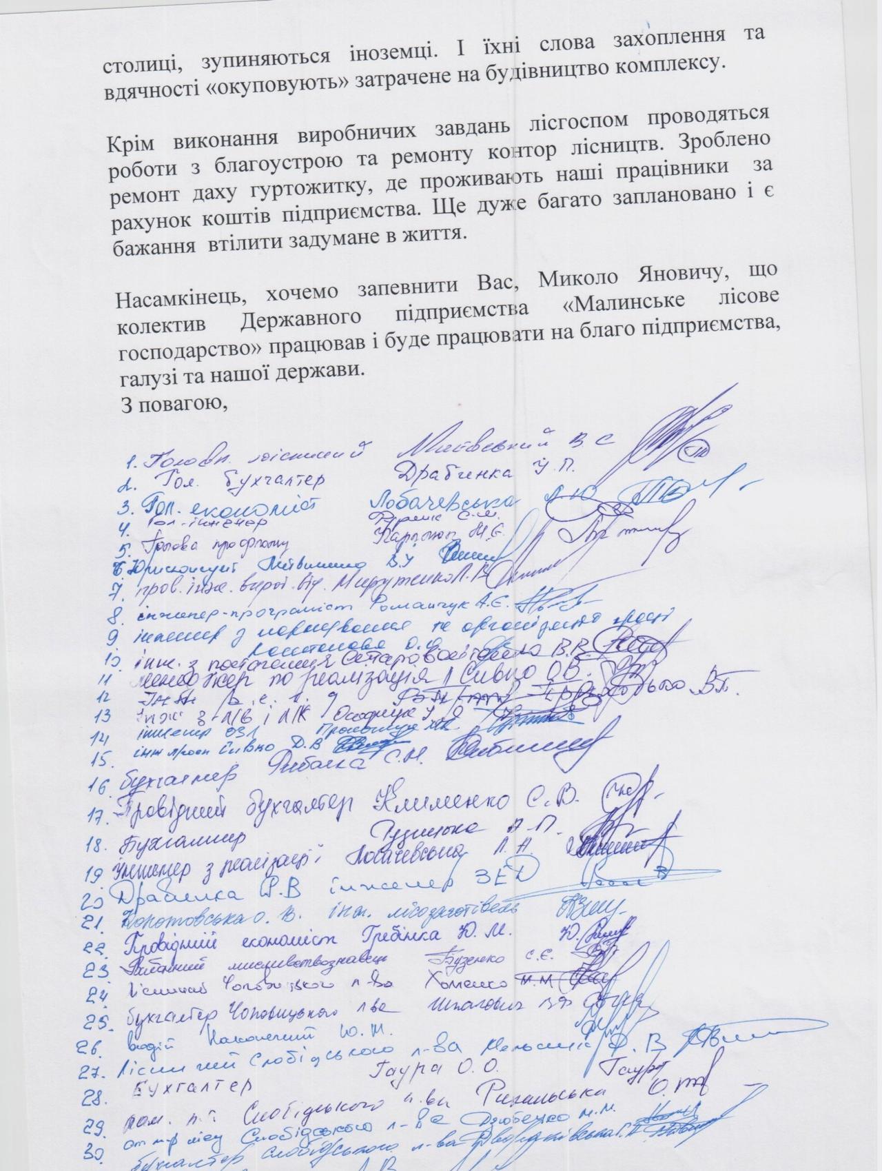 Державне підприємство «Малинське лісове господарство» є одним із найбільших та бюджетоутворюючих підприємств Малинського району. За неповний рік роботи підприємства під керівництвом Матіяша В.Б лісгосп із відстаючих став одним із кращих серед підприємств Житомирського обласного управління, яке має найвищі показники господарсько-фінансової діяльності за підсумками роботи в І півріччі цього року. І кому ж як не Тетяні Михайлівні знати, яких зусиль докладали всі працівники лісгоспу для досягнення такого результату. Тому нас глибоко обурили перекручені факти нашої роботи і наших здобутків, які викладені у зверненні до Вас, Миколо Яновичу.