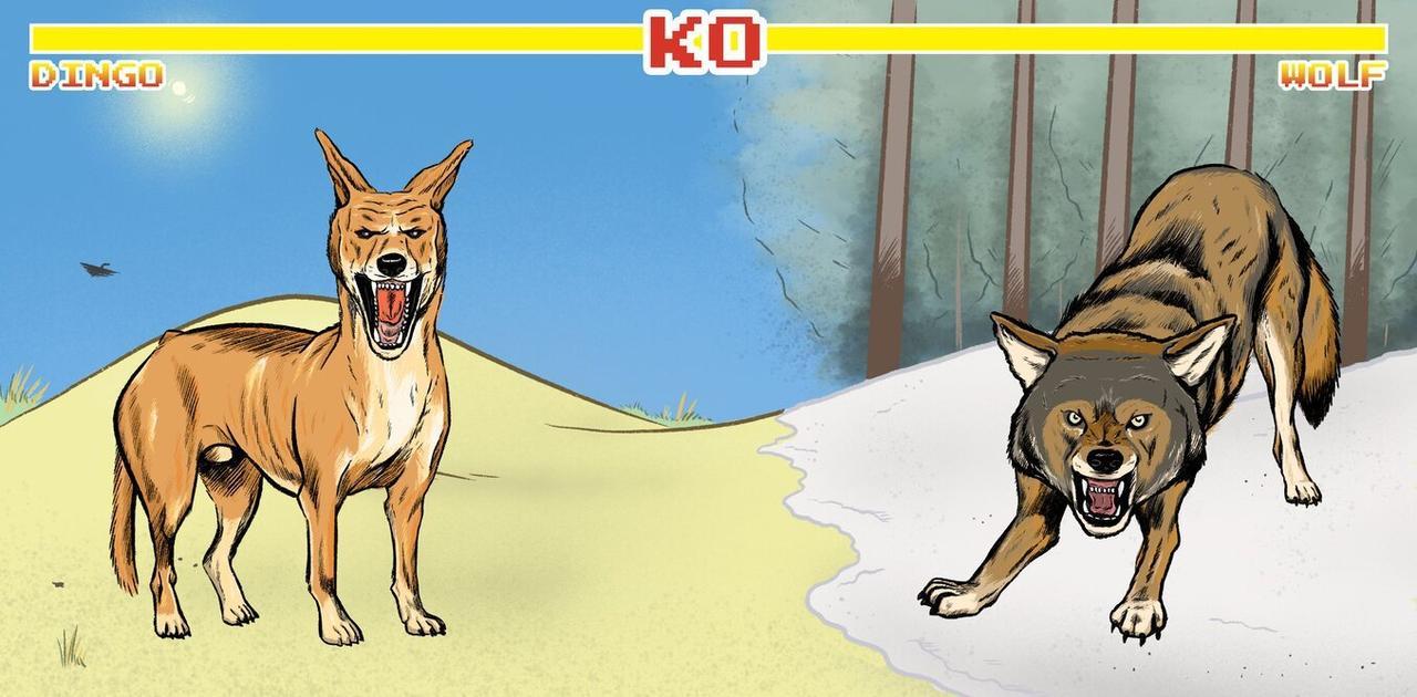Ученые предположили, как могла бы сложиться битва между обыкновенным волком и динго из гористой местности в Австралии. У диких собак драки происходят по многим причинам: они могут отстаивать главенство в стае, сражаться за самку или биться за свою территорию.