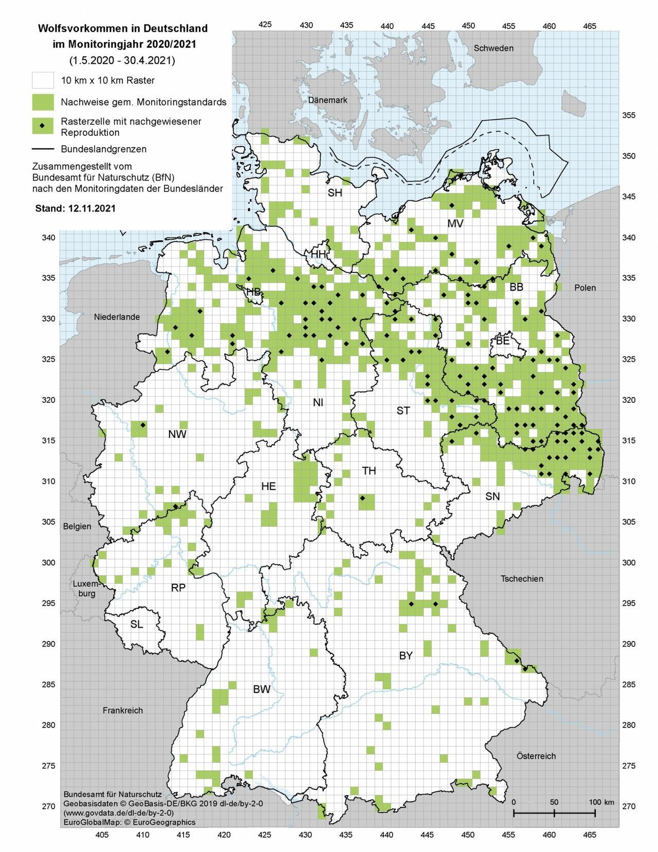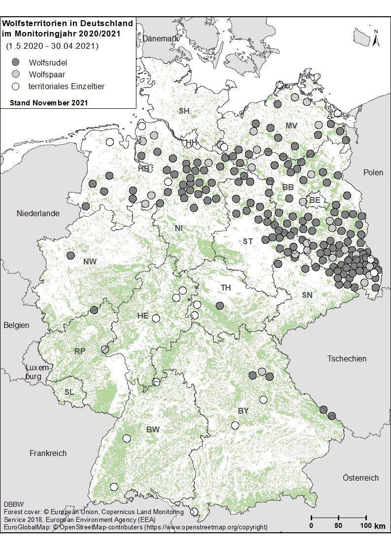 Если в отчетном 2019/2020 году в Германии все проживало 128 стай волков, 35 территориальных пар и 10 территориальных отдельных волков, в 2020/21 году уже насчитывалось 157 волчьих стай, 27 пар волков и 19 оседлых индивидуальных волков. Большинство волков в Германии обитает в районе, который простирается от Саксонии в северо-западном направлении через Бранденбург, Саксонию-Ангальт и Мекленбург-Западную Померанию до Нижней Саксонии. Другие волчьи территории были обнаружены в Баден-Вюртемберге, Баварии, Гессене, Северном Рейне-Вестфалии и Тюрингии.