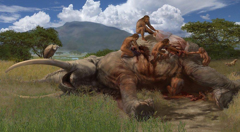 В частности, треть костей, оставленных Homo erectus на стоянках около миллиона лет назад, принадлежала предкам слонов, которые весили до 13 тонн и обеспечивали людей 90% их пищи. Средний вес всех животных, на которых охотились люди в то время, составлял 3 тонны, а кости хоботных находили почти во всех местах вплоть до периода 500 000 лет назад. Затем около 400 000 лет назад люди, жившие в этом регионе — ранние предки неандертальцев и Homo sapiens — охотились в основном на оленей, а также на некоторых более крупных животных весом почти в тонну, таких как дикий крупный рогатый скот и лошади. И наконец, на стоянках, населенных современными людьми, относящихся к периоду от 50 000 до 10 000 лет назад, примерно 70% костей принадлежат газелям, чей вес не превышает 30 кг. Другие останки, обнаруженные на этих стоянках, в основном принадлежат лани и совсем мелким животным, таким как зайцы и черепахи.