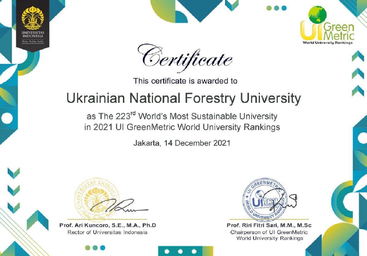 У 2021 році університет вчетверте увійшов до міжнародного рейтингу UI Green Metric World University Ranking і посів перше місце серед “Зелених університетів” України, а серед освітніх установ світу – 223 місце з-поміж 956 університетів із 95 країн.