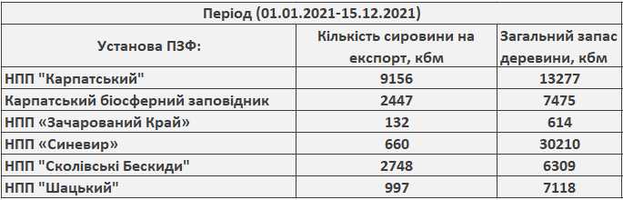 Так, за період із 1 січня до 15 грудня 2021 року антилідером з експорту деревини серед цих установ виявився Карпатський національний природний парк, де більше половини (69%) від загальної кількості отриманої під час рубок деревини потім розпилюється і йде закордон. Наступними йдуть НПП «Сколівські Бескиди» – 44%, Карпатський біосферний заповідник – 33%, НПП «Зачарований Край» – 22%, НПП «Шацький» – 14% та НПП «Синевир» -2%.