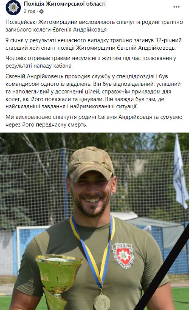 Загиблим виявився начальник 1-го відділу з проведення спеціальних операцій управління Корпусу оперативно-раптової дії (КОРД) ГУНП у Житомирській області старший лейтенант поліції Євген Андрійковець.