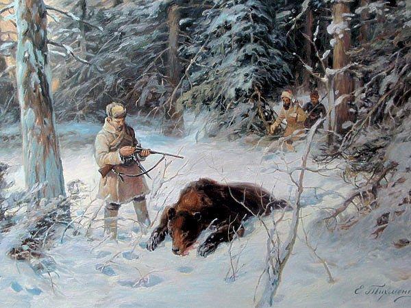 Два выстрела слились в одном звуке, и медведь сперва остановился, как бы не решаясь бежать далее, а затем завалился на бок и нехотя «поехал» в берлогу. Туша его стукнулась о ствол чахлой елочки, сбив с нее кухту. Серебряная пыль снега оседала на шкуру зверя, а он шевелился все тише и тише, точно надолго устраивался на лежку. Еще несколько раз качнулись сучья ели, и все успокоилось.