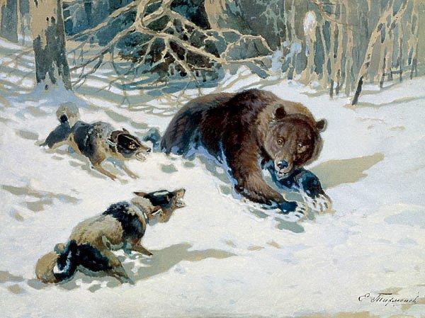 Неистово лаял Фуфуня, в бессильной злобе грыз гнилой пень ели, стараясь освободиться от цепи. Хозяин берег свою лайку и не спускал ее на берлогу для побудки зверя. Лайка в этот момент может легко попасть под выстрел или в лапы зверя. Лесник потолкал мертвого медведя длинным сучком и только потом спустил собаку с цепи.