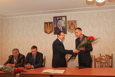 Валерій Лозицький вручив Сергію Аніщенку букет червонив троянд і побажав, щоб він продовжував добрі традиції підприємства-лідера.