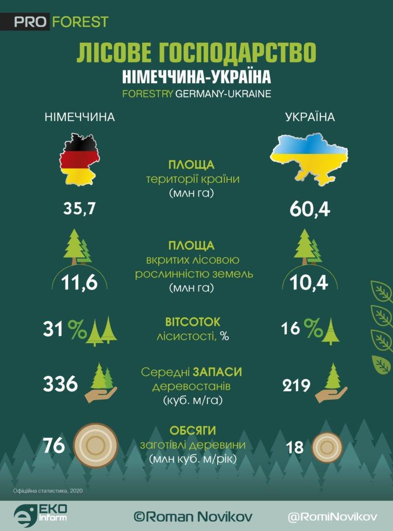 Площа Німеччини складає 35,7 млн га, України – 60,4.Площа вкритих лісовою рослинністю земель у Німеччині – 11,6 млн га, в Україні – 10,4.Відсоток лісистості у Німеччині – 11,6%, в Україні – 10,4.Середні запаси деревостанів у Німеччині сягають 336 куб. м на га, в Україні – 219.Обсяги заготівлі деревини в Німеччині – більше 76 млн куб. м на рік, в Україні – 18.* офіційна статистика 2020 р.