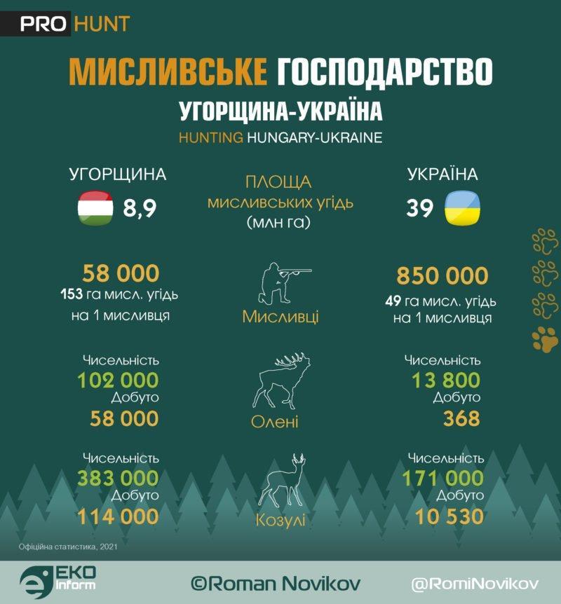 Кількість угорських мисливців 58 тис. осіб (на одного мисливця припадає 153 га мисл. угідь). В Україні 850 тис. мисливців (на одного мисливця припадає 49 га мисл. угідь).