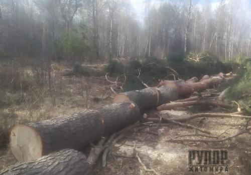 Наступного дня до відділення поліції №1 смт Ємільчиного надійшло повідомлення працівника місцевого лісгоспу про незаконну порубку дерев поблизу с. Яменця. На місці події поліцейські виявили 15 зрубаних сосен та встановили, що до протиправних дій причетні двоє місцевих жителів віком 19 та 24 років. Поліцейські провели першочергові заходи, вилучили бензопили й інші свідчення.