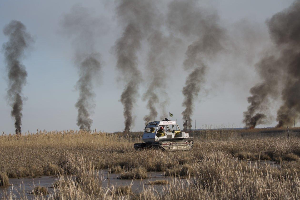 Управляемый пожар оказался сложным делом, занявшим весь день. Сначала члены пожарной бригады проехали на похожих на танки Marsh Masters через грязную почву, чтобы утрамбовать и намочить траву, создав тем самым противопожарную полосу и затем поджечь сухую болотную траву. Даже с учетом этих предосторожностей все пошло не так, как планировалось. Пламя вырвалось из болота в соседний перелесок из мертвых сосен, который экипаж сжигать не планировал. Это вынудило Службу охраны рыбных ресурсов и дикой природы задействовать пожарную машину, чтобы пополнить резервуары воды для экипажа.