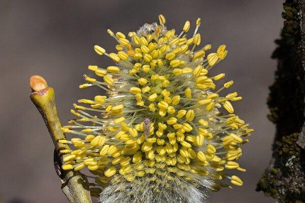 Под тёплыми солнечными лучами сквозь серые пушинки начинают прорастать мужские цветки, наполненные жёлтой пыльцой. Эти многочисленные цветки и придают деревьям такой необычный праздничный вид.