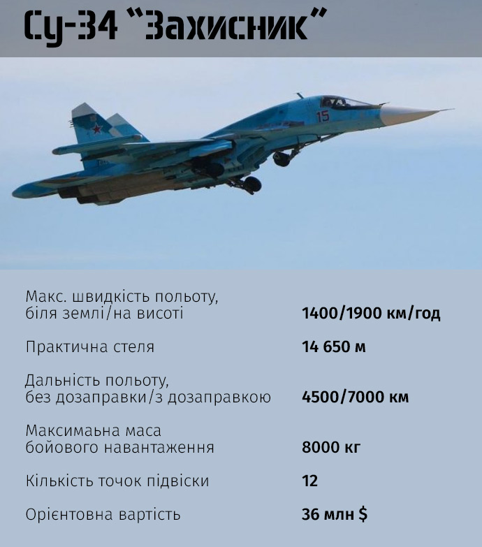 Під час повномасштабної фази війни у небі над Україною найчастіше можна спостерігати винищувач-бомбардувальник Су-34 (за кодифікацією НАТО: Fullback – “Захисник”) призначений для нанесення ракетно-бомбових ударів удень і вночі, зокрема й на малих висотах, по наземних і надводних цілях, а також для знищення повітряних цілей противника.
