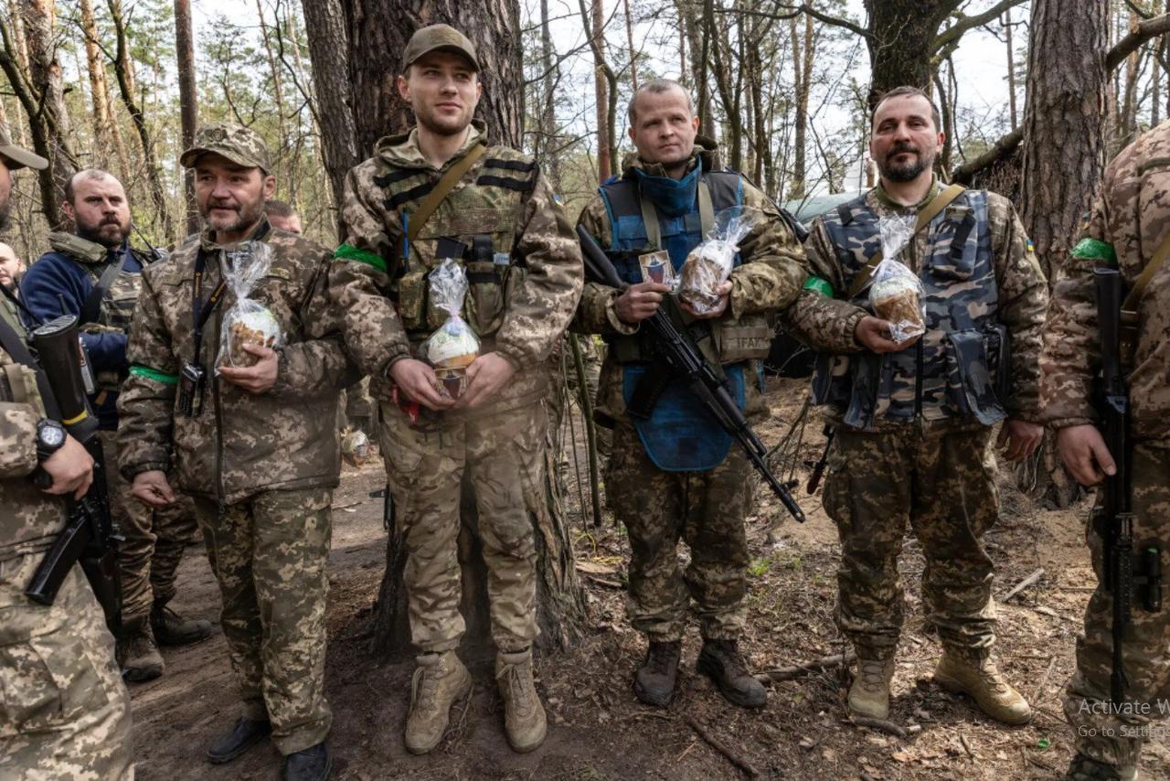 Военнослужащие Сил территориальной обороны Украины держат пасхальный сладкий хлеб возле своих окопов на оборонительной позиции в лесу на окраине столицы Киева в субботу. Фото… Дэвид Гуттенфельдер для The New York Times