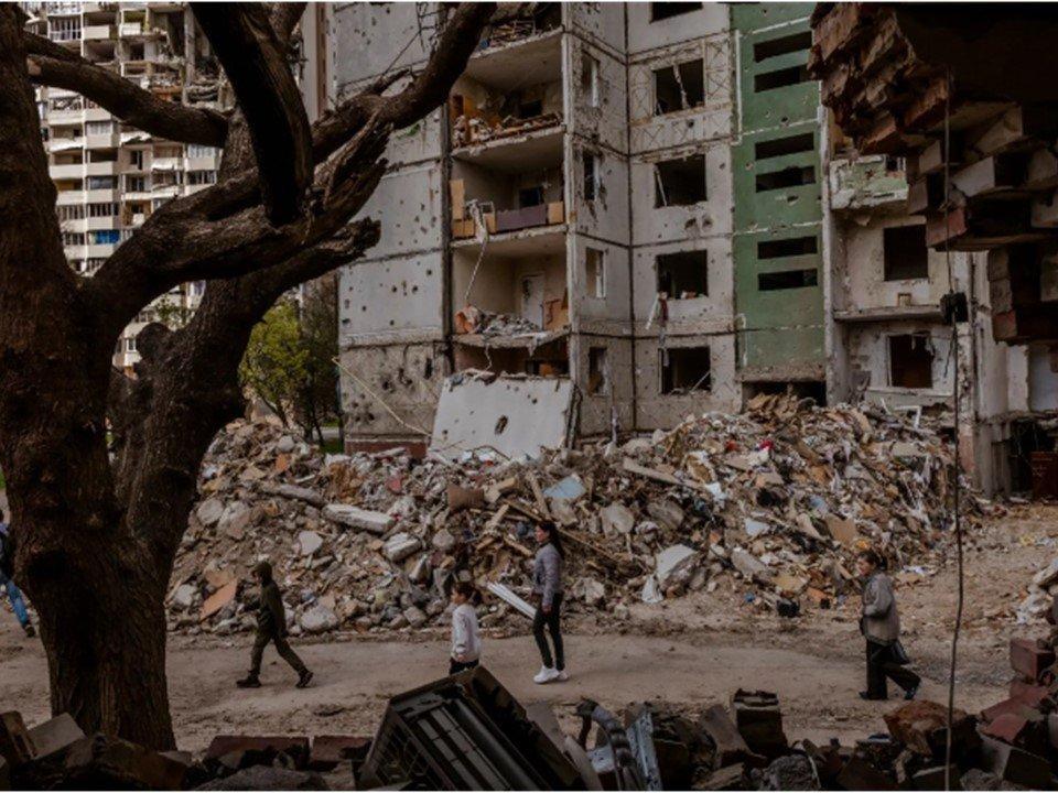 В пятницу люди в Чернигове, Украина, проходят мимо многоквартирного дома, сильно пострадавшего от российского обстрела. Фото Даниэль Берегулак для The New York Times