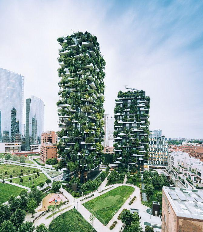 ак проводять озеленення у Мілані. Дві зелені вежі-близнюки збудовані у центрі Мілана. Спроєктовані вони італійським архітектором Стефано Боєрі та його партнерами з архітектурної фірми Boeri Studio. Будівництво будівель розпочалося у 2008 році, а закінчилося у 2014. Їх висота становить 110 та 80 метрів.