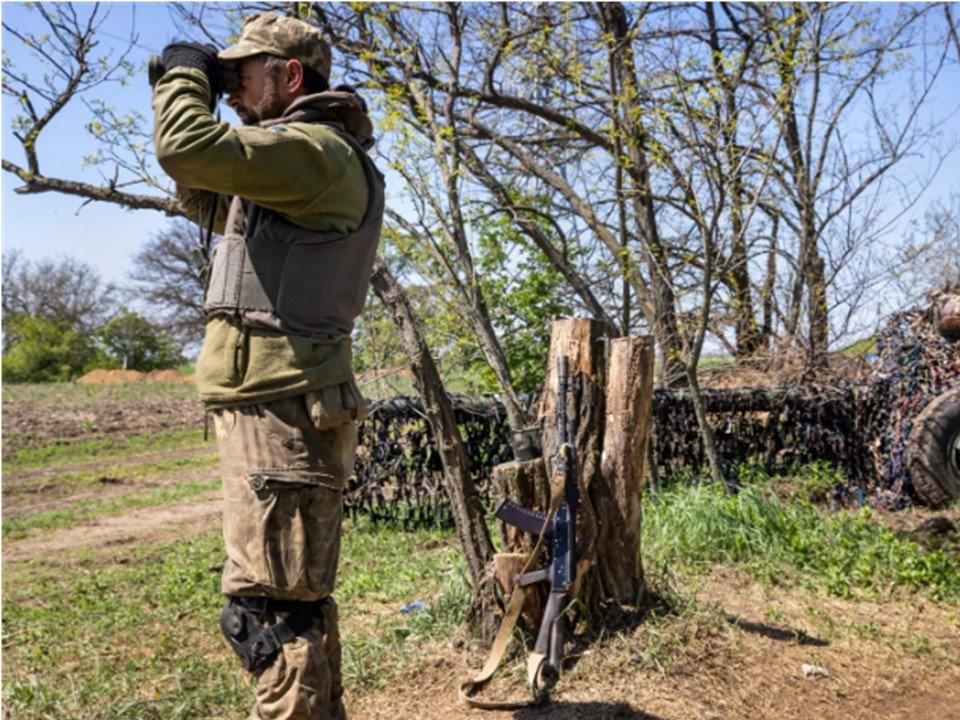 Солдат на артиллерийской позиции ближнего действия на юге Украины наблюдает за передвижениями русских на расстоянии. Фото Дэвид Гуттенфельдер для The New York Times