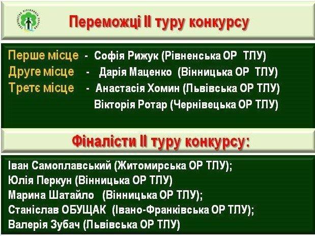 Президія Товариства лісівників України вітає переможців конкурсу за наполегливість, і бажає всім фіналістам обрати професію до душі і стати студентами обраних вами вишів. Сподіваємося, що у наступні роки у науково-дослідницькому конкурсі братимуть участь випускники всіх 25 областей України і АР Крим і ми під мирним небом у столиці України будемо вручати нагороди переможцям нашого щорічного Всеукраїнського конкурсу дослідницьких робіт випускників учнівських лісництв!