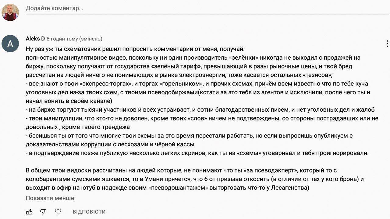 Малоймовірно, що в лісову галузь повернуться схематозні «напрацювання» Данііла й він це сам чітко розуміє. Тому всі його відео з критикою всіх і вся – є просто шантажем й намаганням щось вторгувати для себе, є криком душі й бажанням хоч якось насолити тим, хто закрив його багаторічні злодійські грошові потоки.