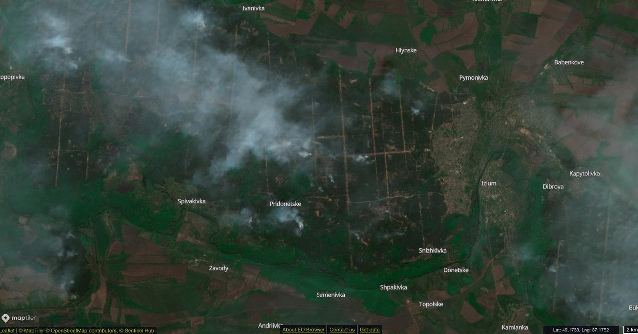 Пожежі в лісах поблизу Ізюма, спричинені артилерійськими обстрілами (знімок Sentinel 2 за 8 травня)