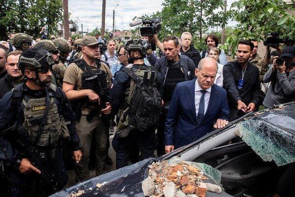 Канцлер выглядел заметно взволнованным во время визита в разрушенный киевский пригород Ирпень. «Все становится еще хуже, когда видишь, насколько ужасно бессмысленно насилие», — сказал он о том, что он назвал «российской агрессивной войной».