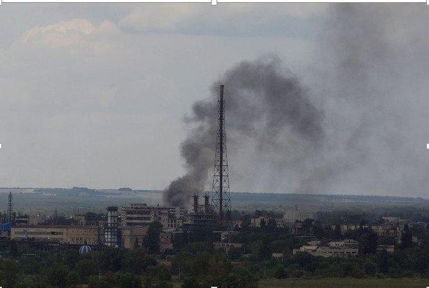 Дым поднимается после огнвого удара по территории северодонецкого химического завода «Азот», пока продолжается наступление России на Украину, Лисичанск, Луганская область, Украина, 18 июня 2022 года. REUTERS/Анна Кудрявцева