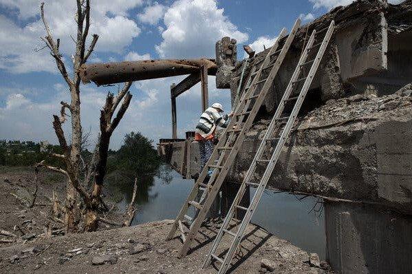 Светлана Живага, 54 года, жительница Лисичанска, преодолевает один из разрушенных мостов, по которому до сих пор перемещаются гражданские лица из Лисичанска в Северодонецк и обратно, в пятницу.