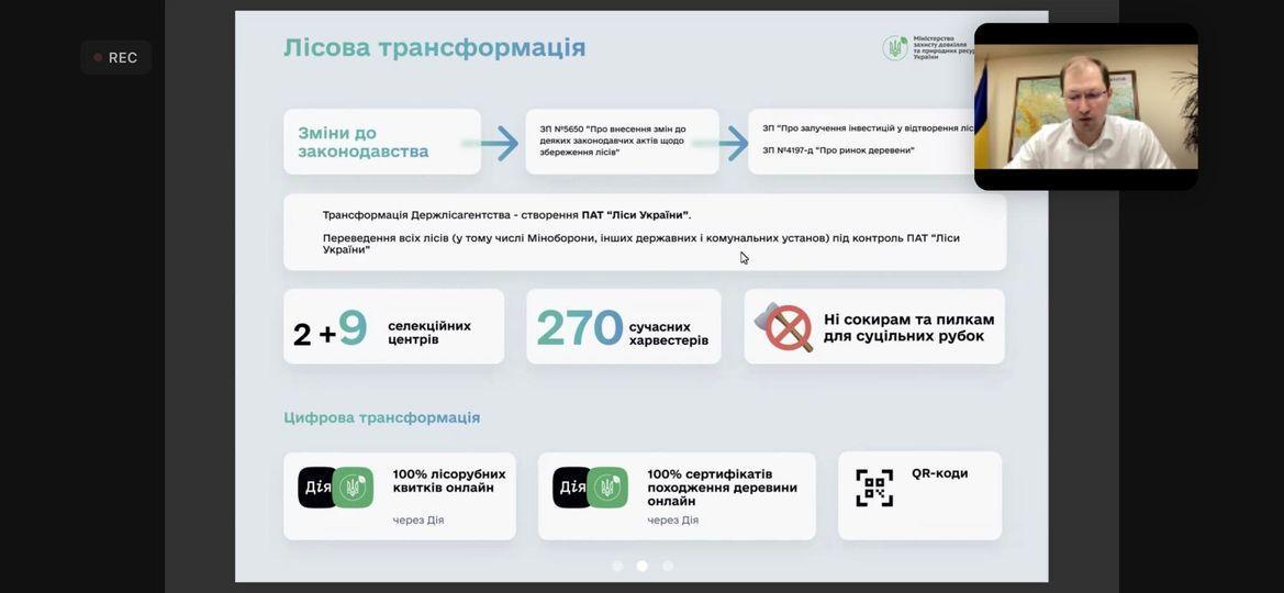 (Руслан Стрілець презентував оновлену довкіллеву стратегію діяльності Міністерства захисту довкілля та природних ресурсів України. Серед основних завдань стратегії лісова трансформація. Трансформація Держлісагенства передбачає створення ПАТ “Ліси України”)