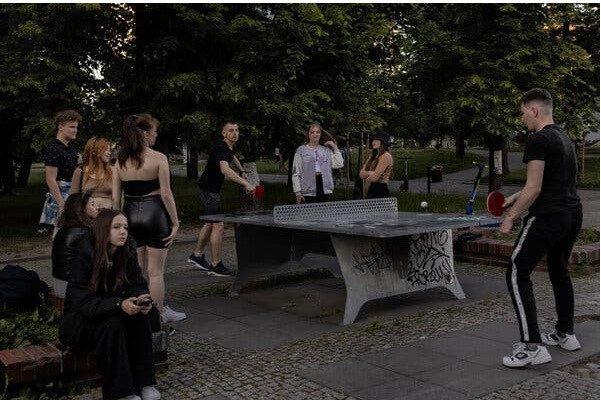 Некоторые бежали в столицу Польши в одиночку. Все испытывают глубокое беспокойство по поводу будущего. Для молодых украинцев, собирающихся в столицу Польши, парк предлагает место, где они могут вместе попытаться справиться с ситуацией.