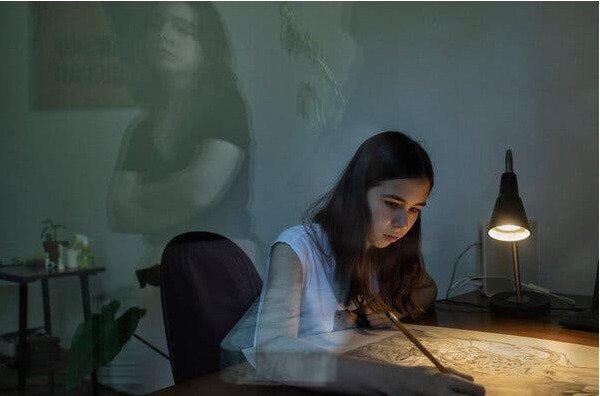 Она носит большие наушники и слушает Чайковского и японский хип-хоп. Люди разговаривают в комнате, входят и выходят, но ее внимание сосредоточено исключительно на карандаше в руке и появляющихся фигурах.