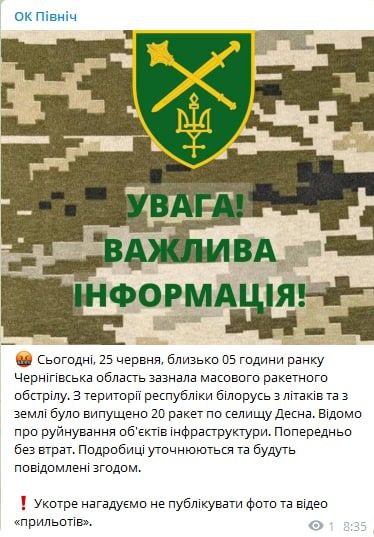Сьогодні, 25 червня, близько 05 години ранку Чернігівська область зазнала масового ракетного обстрілу.