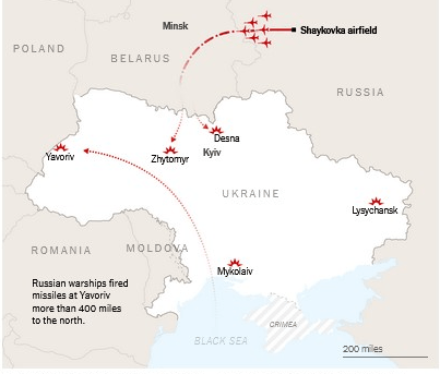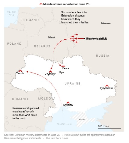 Украинская разведка сообщила, что шесть российских ударных бомбардировщиков Ту-22М3 взлетели с аэродрома Шайковка в Калужской области России, пролетели над Смоленском, а затем вошли в воздушное пространство Беларуси. По словам официальных лиц, когда они оказались примерно в 30 милях (48 км) от границы с Украиной, они выпустили не менее 12 крылатых ракет, прежде чем вернуться в воздушное пространство России. По словам военных, ракеты поразили цели в северной части страны.
